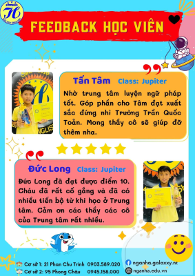 Gần đây, Galaxy English nhận được vô số feedback tích cực từ phụ huynh đang cho con theo học tại Trung tâm. Những đánh giá từ Quý phụ huynh và học viên luôn là niềm cảm hứng....