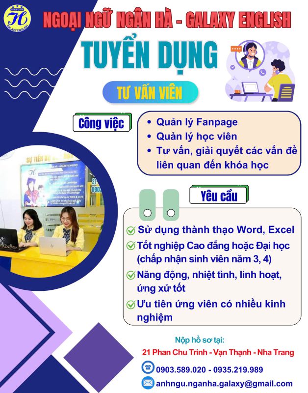 Nộp hồ sơ và phỏng vấn: Trung tâm Ngoại ngữ Ngân Hà – 21 Phan Chu Trinh hoặc qua email: anhngu.nganha.galaxy@gmail.com