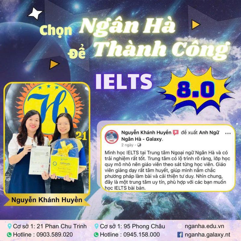 Trung tâm Ngoại ngữ Ngân Hà – Galaxy English hân hoan gửi lời chúc mừng đến bạn NGUYỄN KHÁNH HUYỀN, bạn học viên tài năng đã xuất sắc đạt IELTS 8.0 ngay trong lần thi đầu tiên sau hơn một năm nỗ lực học tập và rèn luyện cùng Ngân Hà! 🌈✨